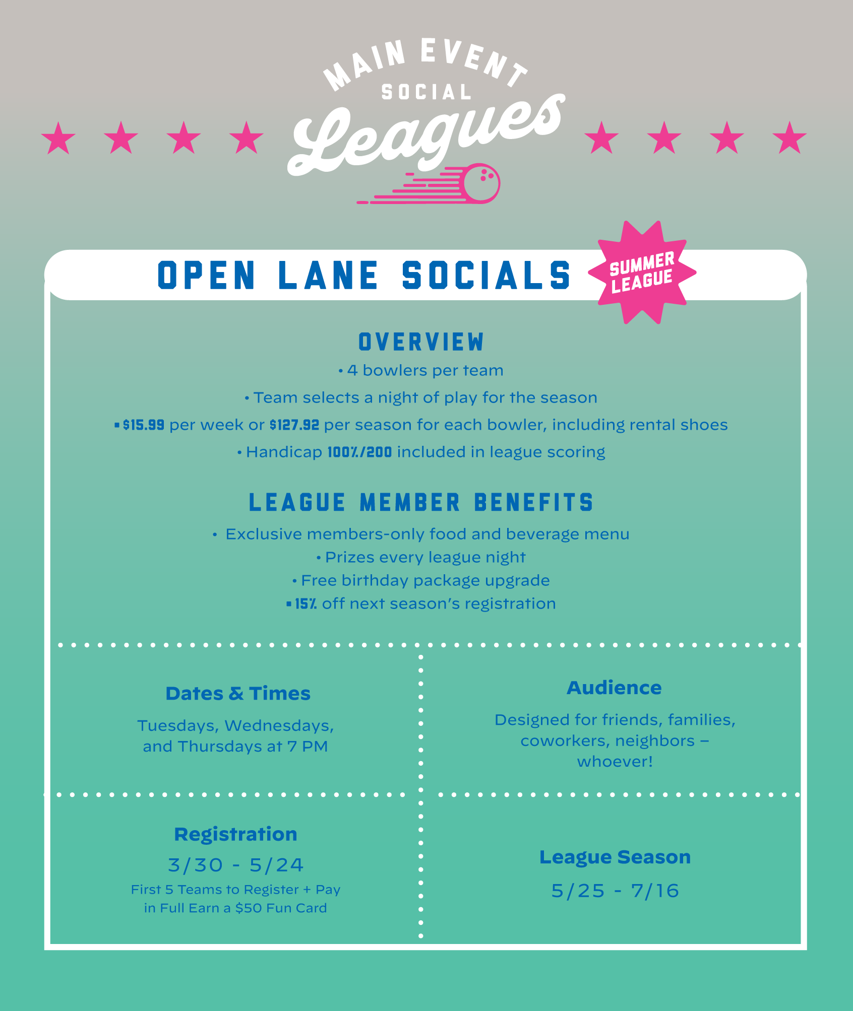 Unmissable. Unskippable. Unstoppable. Open Lane Socials are rolling to a lane near you, so gather your crew and get in on the fun. Registration ends 5/24!