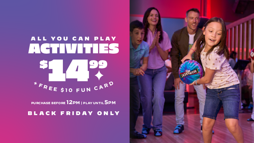 PROMOTIONAL. Valid on 11/28/25, ONLY. Price and participation vary by location. Available for purchase every day before 12p.m, play up to 5p.m. Activities may vary by center. Promotion may end or be revised at any time without notice. Activity time limited to space availability. Only 200 passes available per center. Offer excludes food, drinks, video games, VR, bowling shoe rental and taxes. Main Event reserves the right to place up to 6 people per bowling lane. Lane time may be limited to 1 hour based on availability. Laser Tag and Gravity Ropes have a height requirement of 48" to play. Excludes Gel Blaster. Not valid with any other offer or group reservations. Additional restrictions may apply.